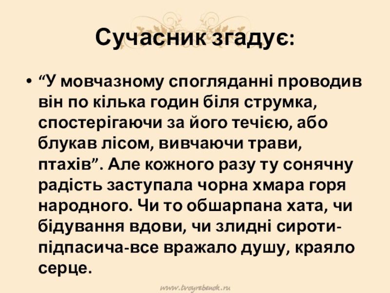 “У мовчазному спогляданні проводив він по кілька годин біля струмка,
