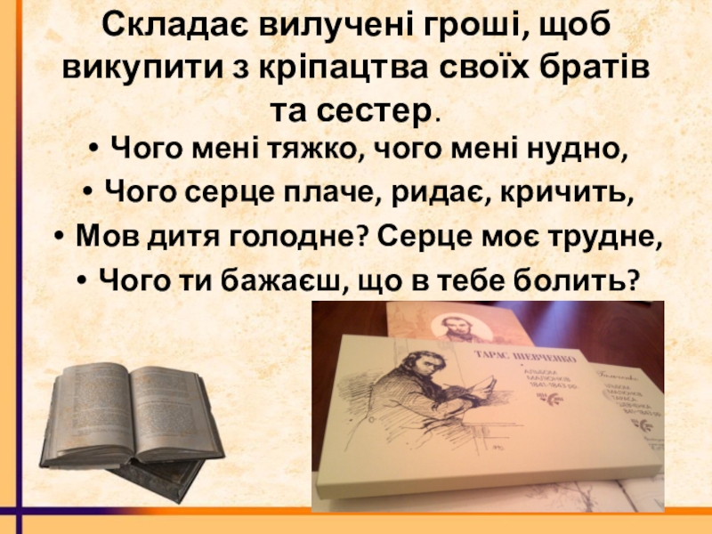 Слайд 26Складає вилучені гроші, щоб викупити з кріпацтва своїх братів та сестер.