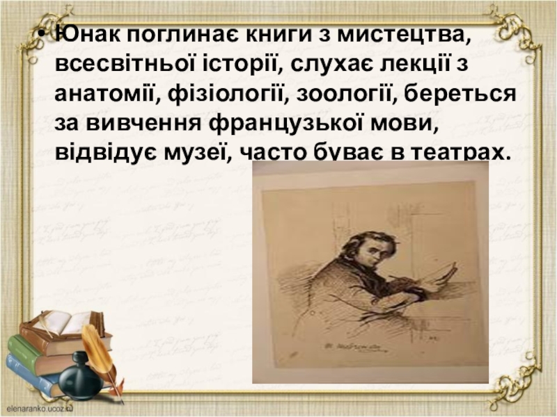 Юнак поглинає книги з мистецтва, всесвітньої історії, слухає лекції з анатомії,