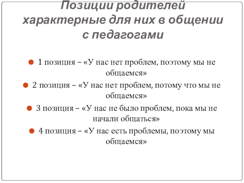 Слайд 16Позиции родителей характерные для них в общении с педагогами