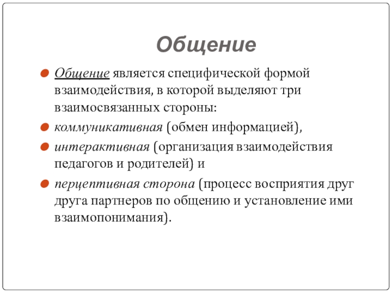 Общение является специфической формой взаимодействия, в которой выделяют три взаимосвязанных стороны:
