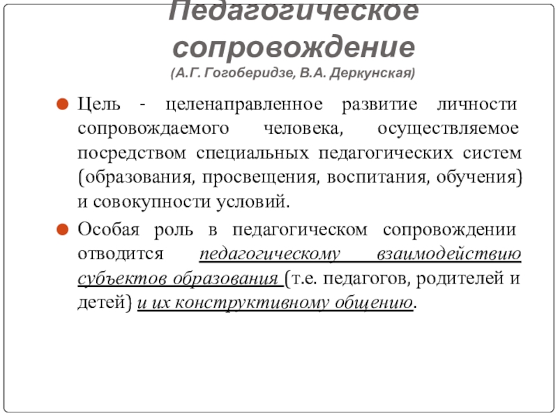 Особая роль в педагогическом сопровождении отводится педагогическому взаимодействию субъектов образования (т.е. педагогов, родителей и детей) и их конструктивному общению.