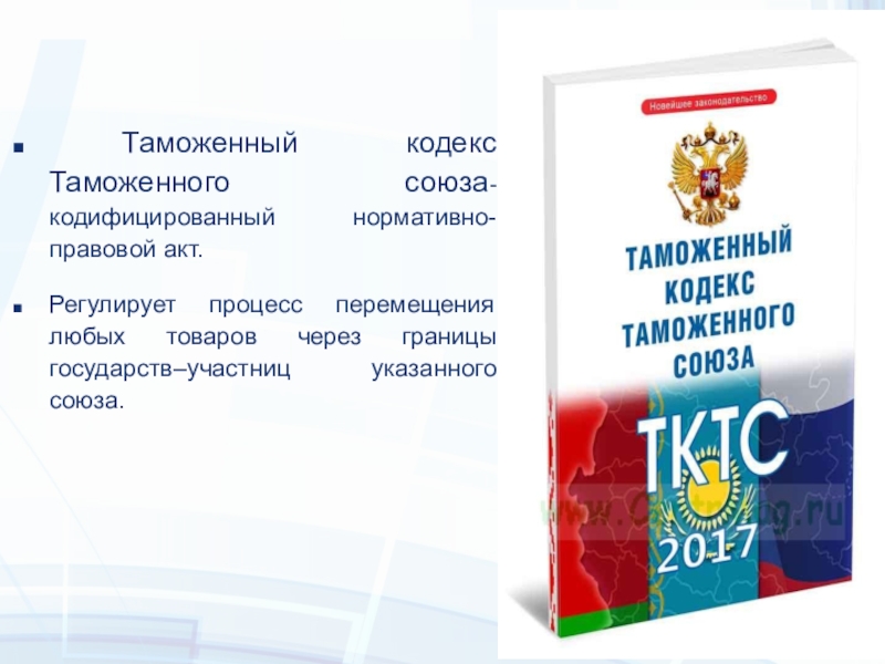 Таможенный кодекс Таможенного союза-кодифицированный нормативно-правовой акт.Регулирует процесс перемещения любых товаров через границы государств–участниц указанного союза.
