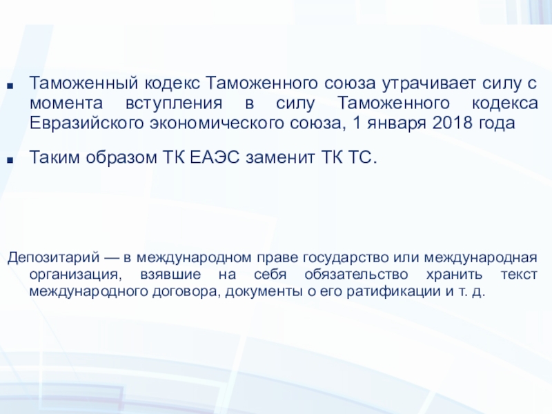 Слайд 6Таможенный кодекс Таможенного союза утрачивает силу с момента вступления в силу