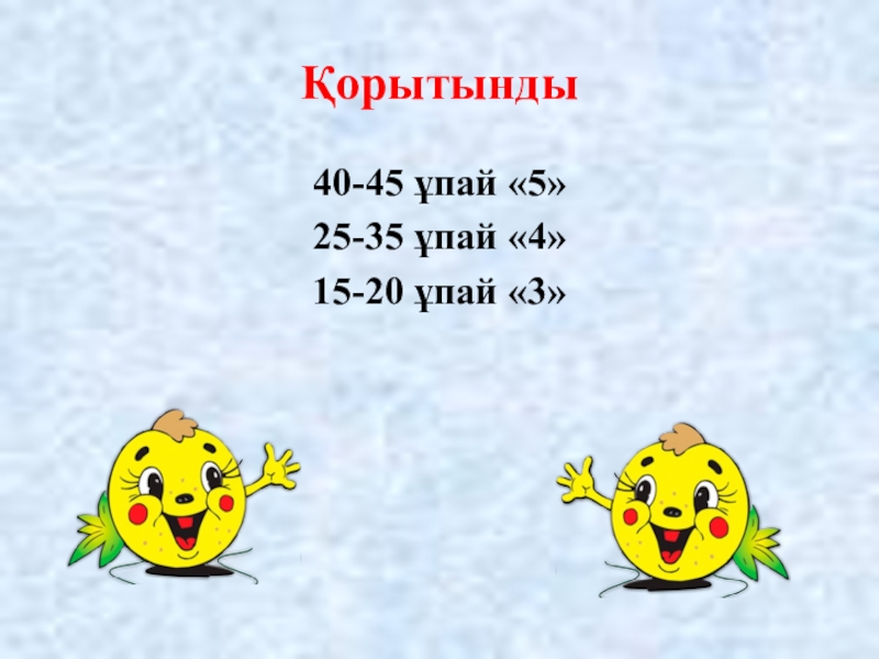 Қорытынды 40-45 ұпай «5»25-35 ұпай «4»15-20 ұпай «3»