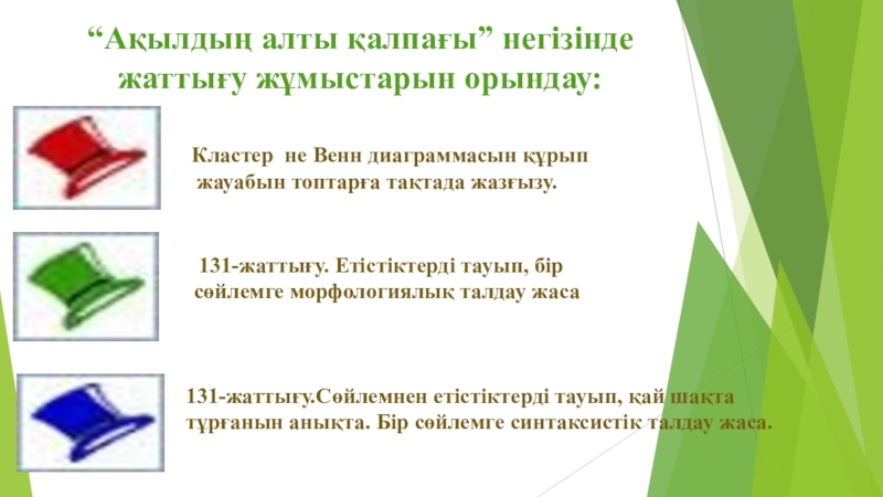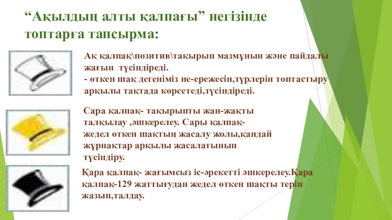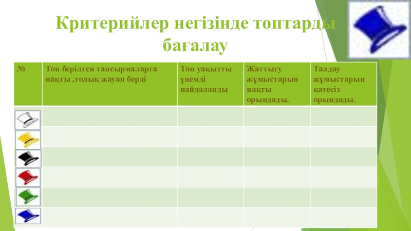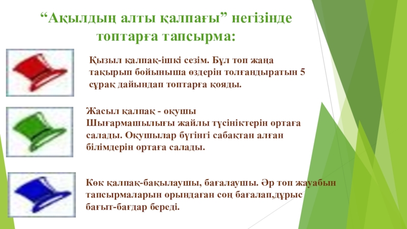 Көк қалпақ-бақылаушы, бағалаушы. Әр топ жауабын тапсырмаларын орындаған соң бағалап,дұрыс