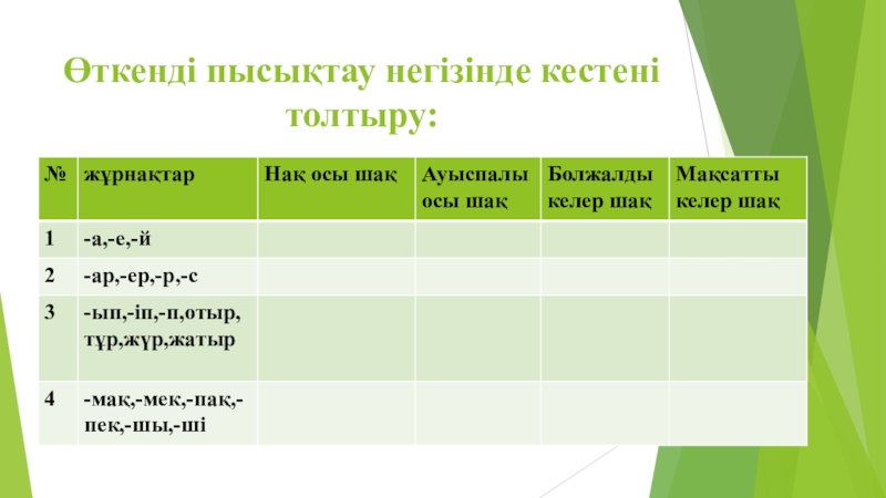 130-жаттығу. Берілген етістіктерден жедел өткен шақ жаса және сөйлем құра. Бір сөйлемге тақтада синтаксистік талдау жаса.