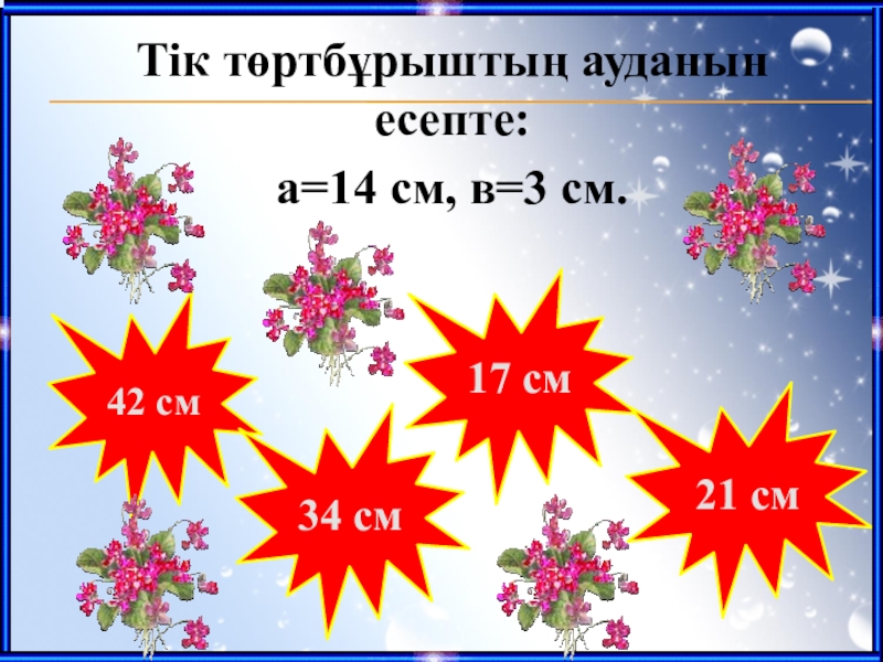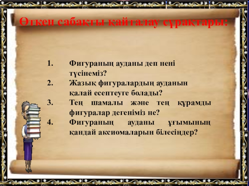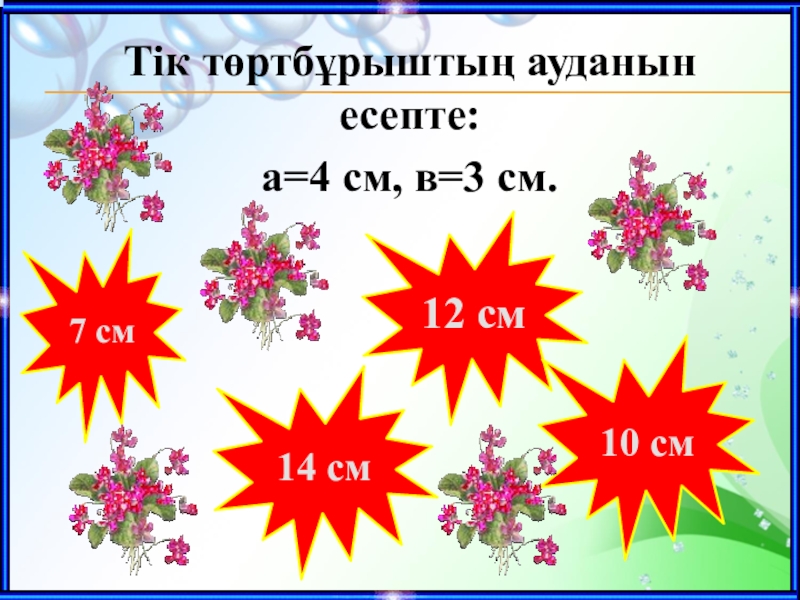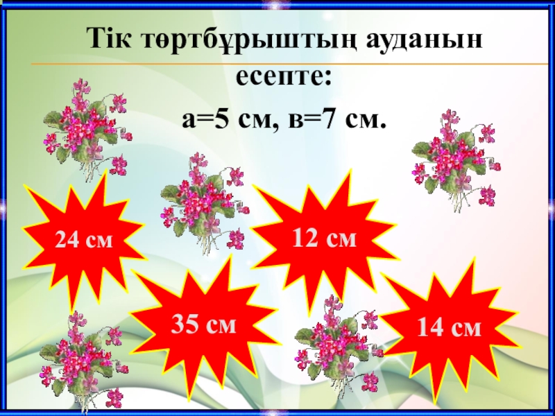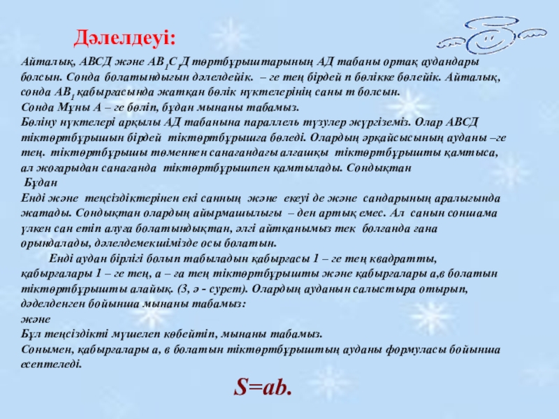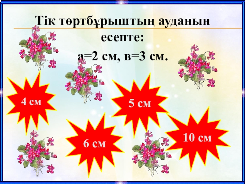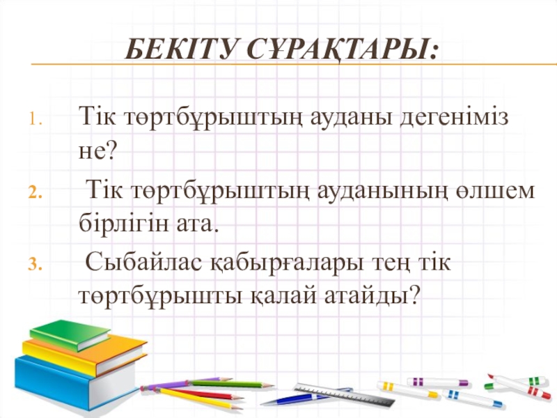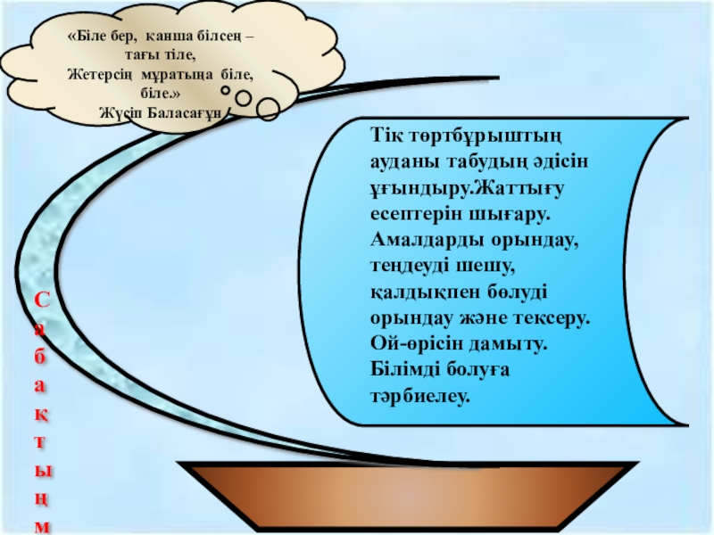 Тік төртбұрыштың ауданы табудың әдісін ұғындыру.Жаттығу есептерін шығару. Амалдарды орындау, теңдеуді шешу, қалдықпен бөлуді орындау және тексеру. Ой-өрісін дамыту. Білімді болуға тәрбиелеу.