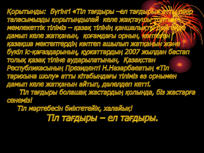 Слайд 17Қорытынды: Бүгінгі «Тіл тағдыры –ел тағдыры» атты пікір таласымызды қорытындылай келе