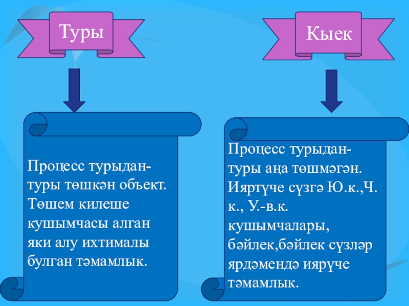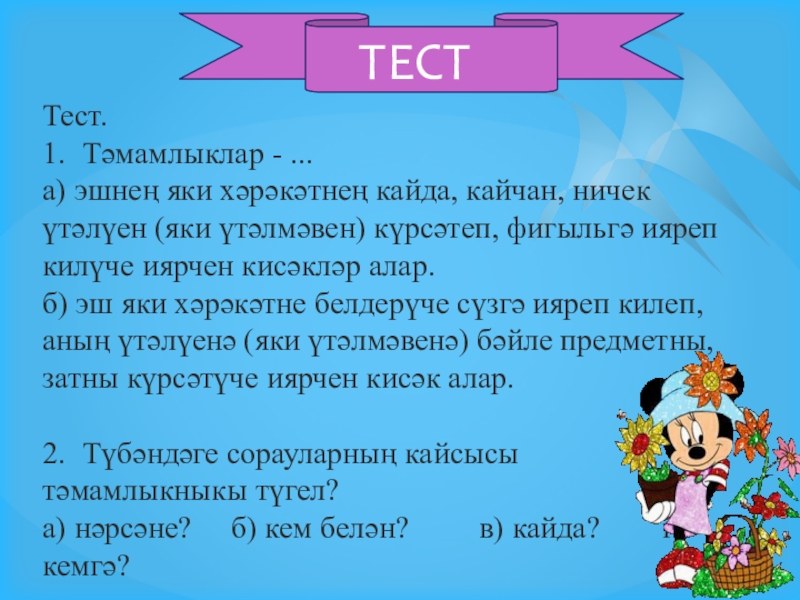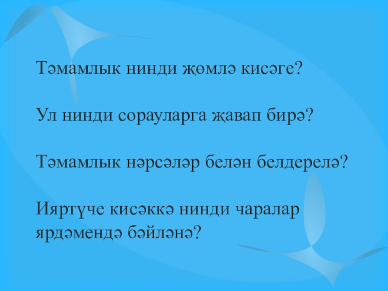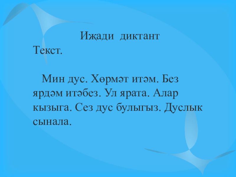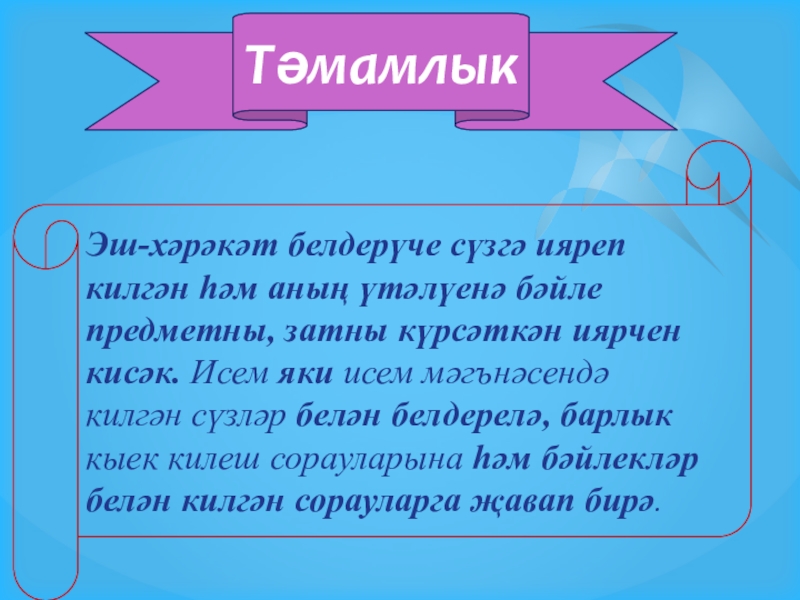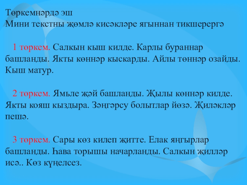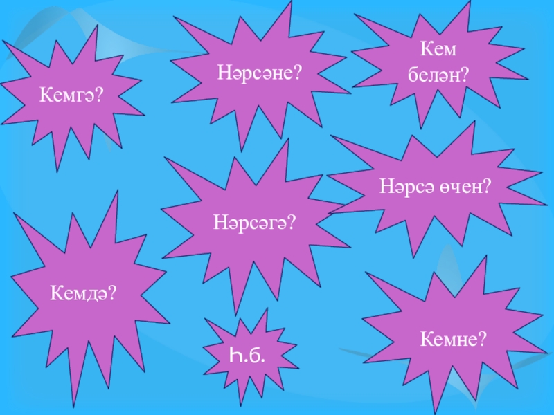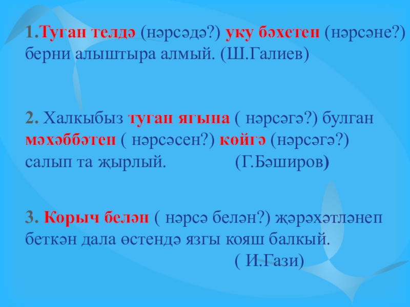 2. Халкыбыз туган ягына ( нәрсәгә?) булган мәхәббәтен ( нәрсәсен?) көйгә (нәрсәгә?) салып та җырлый. (Г.Бәширов)