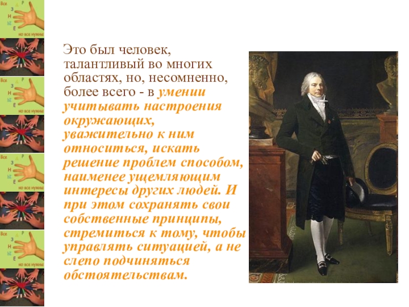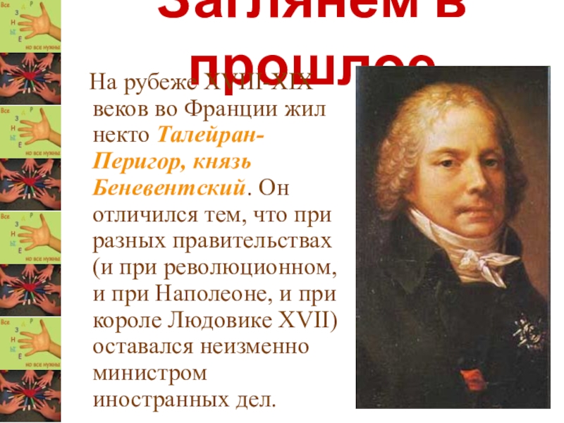 некто Талейран-Перигор, князь Беневентский. Он отличился тем, что при разных правительствах (и при революционном, и при Наполеоне, и при короле Людовике XVII) оставался неизменно министром иностранных дел.