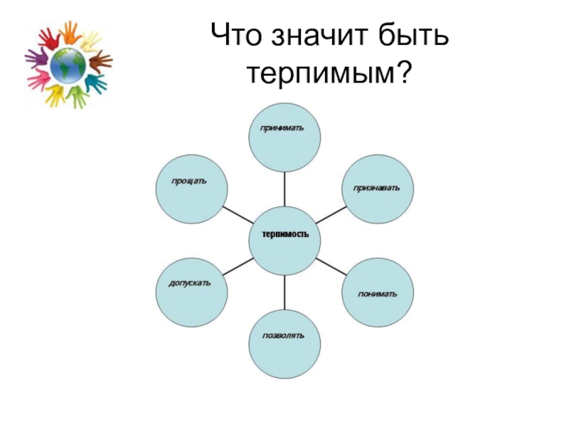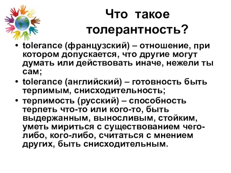 терпимость (русский) – способность терпеть что-то или кого-то, быть выдержанным, выносливым, стойким, уметь мириться с существованием чего-либо, кого-либо, считаться с мнением других, быть снисходительным.