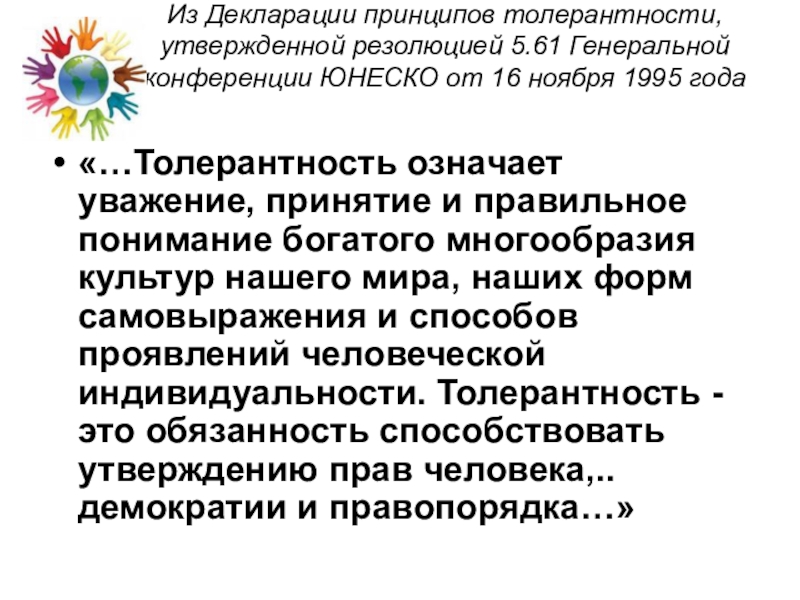 «…Толерантность означает уважение, принятие и правильное понимание богатого многообразия культур нашего мира, наших форм самовыражения и способов проявлений человеческой индивидуальности. Толерантность - это обязанность способствовать утверждению прав человека,.. демократии и правопорядка…»
