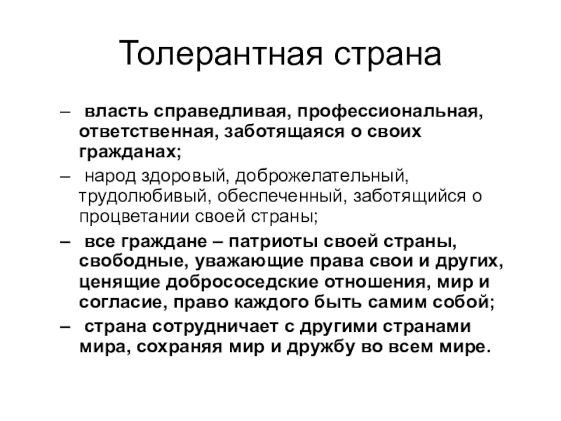 все граждане – патриоты своей страны, свободные, уважающие права свои и других, ценящие добрососедские отношения, мир и согласие, право каждого быть самим собой;