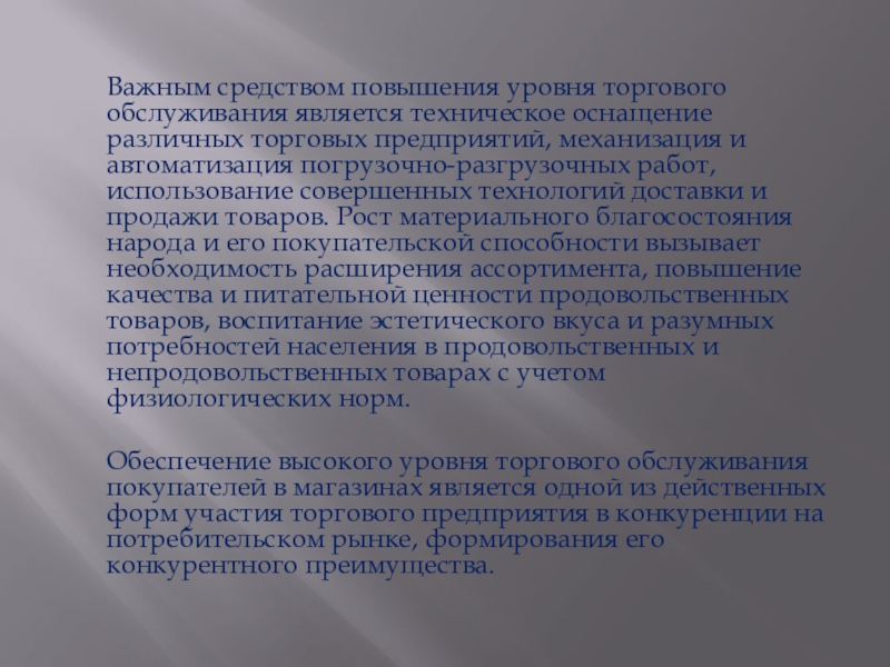 Важным средством повышения уровня торгового обслуживания является техническое оснащение различных торговых предприятий, механизация и автоматизация погрузочно-разгрузочных работ, использование совершенных технологий доставки и продажи товаров, что также ускоряет сам процесс торгового обслуживания покупателей.