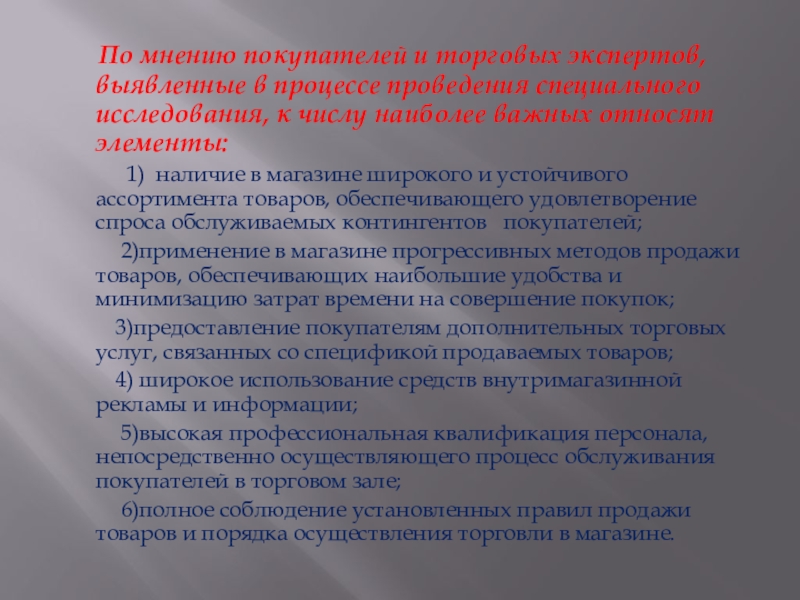 5)высокая профессиональная квалификация персонала, непосредственно осуществляющего процесс обслуживания покупателей в торговом зале;