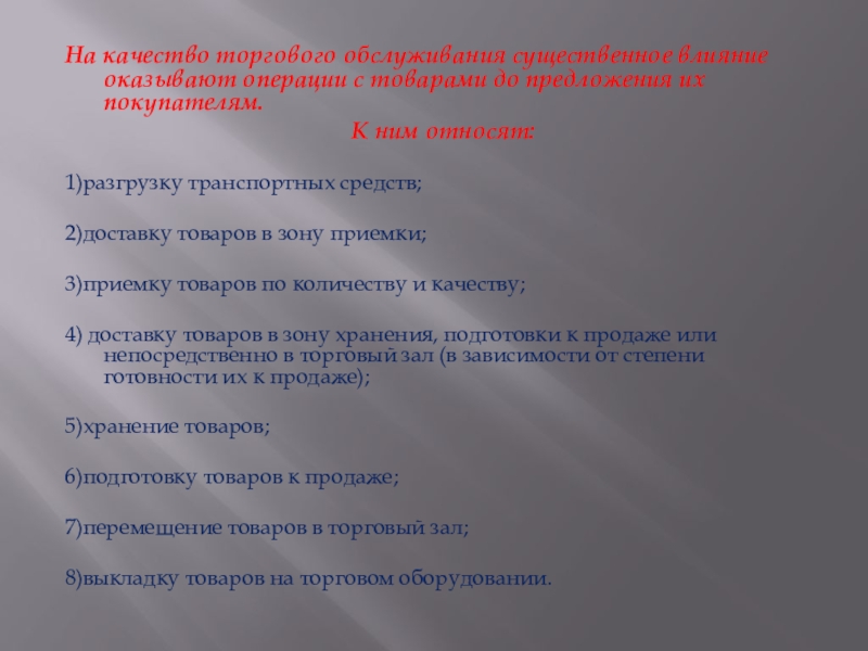 Слайд 9На качество торгового обслуживания существенное влияние оказывают операции с товарами до
