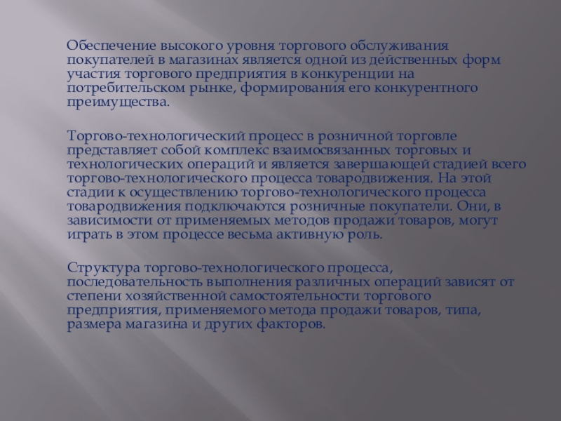 Торговое обслуживание покупателей осуществляется при выполнении в магазинах основного торгово-технологического процесса - продажи товаров. 1