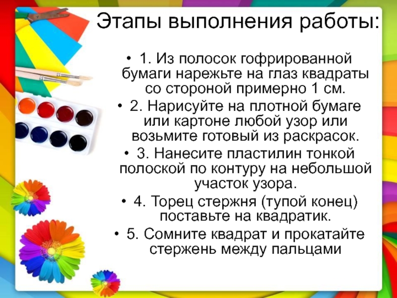 Этапы выполнения работы: 1. Из полосок гофрированной бумаги нарежьте на глаз квадраты со стороной примерно 1 см.2.