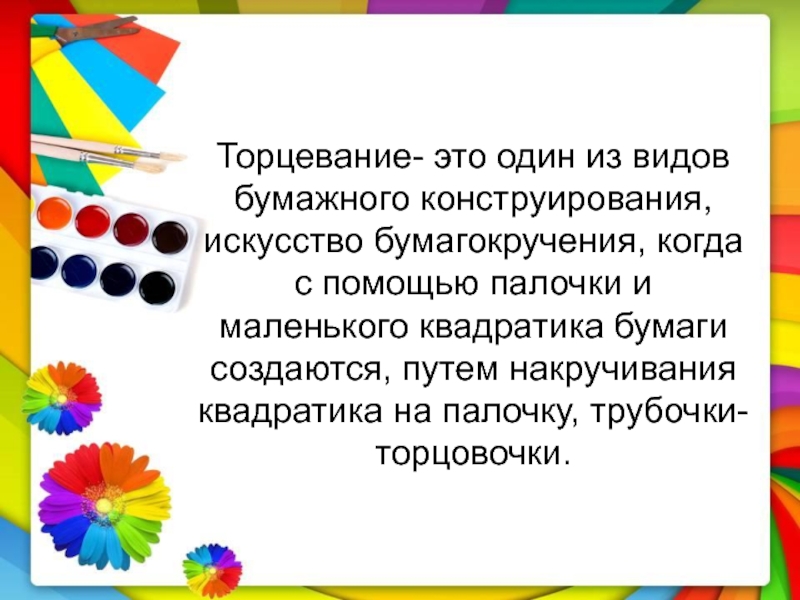Торцевание- это один из видов бумажного конструирования, искусство бумагокручения, когда с помощью палочки и маленького квадратика бумаги создаются, путем накручивания квадратика на палочку, трубочки-торцовочки.
