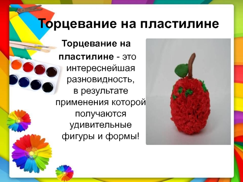 Торцевание на пластилинеТорцевание на пластилине - это интереснейшая разновидность, в результате применения которой получаются удивительные фигуры и формы!