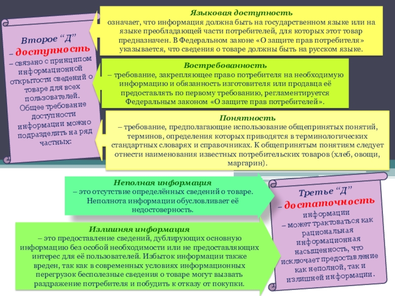 – требование, закрепляющее право потребителя на необходимую информацию и обязанность изготовителя или продавца её предоставлять по первому требованию, регламентируется Федеральным законом «О защите прав потребителей».