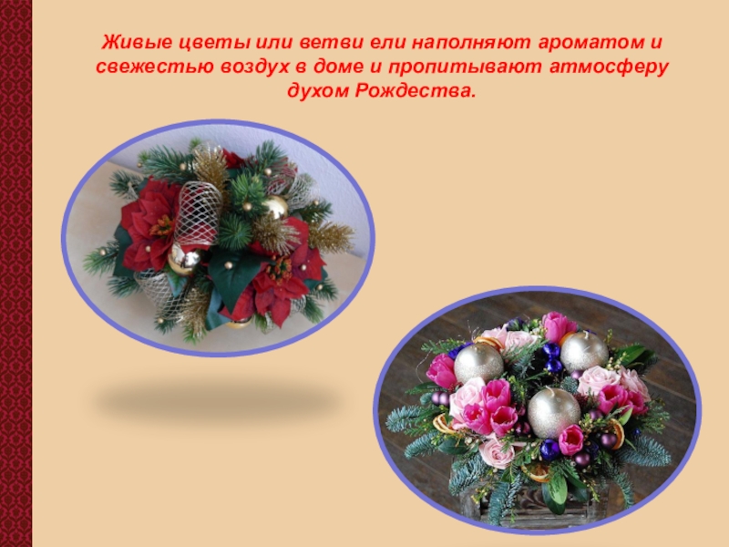 Слайд 16Живые цветы или ветви ели наполняют ароматом и свежестью воздух в
