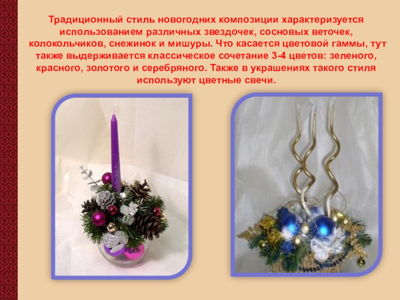 Слайд 3Традиционный стиль новогодних композиции характеризуется использованием различных звездочек, сосновых веточек, колокольчиков,