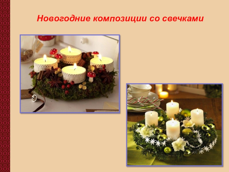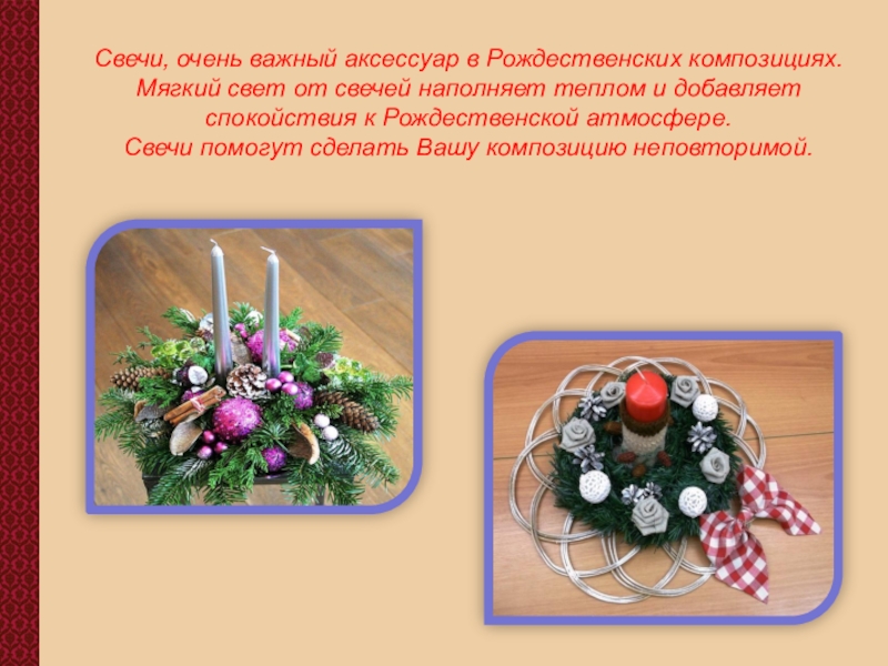 Слайд 13Свечи, очень важный аксессуар в Рождественских композициях. Мягкий свет от свечей
