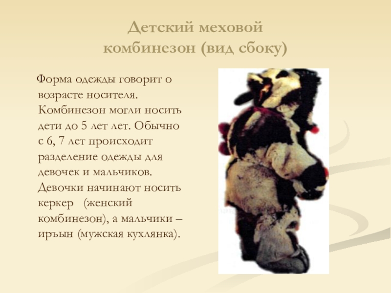 Форма одежды говорит о возрасте носителя. Комбинезон могли носить дети до 5 лет лет. Обычно с 6, 7 лет происходит разделение одежды для девочек и мальчиков. Девочки начинают носить керкер (женский комбинезон), а мальчики – иръын (мужская кухлянка).