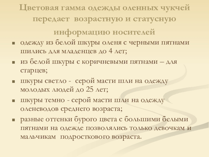 шкуры светло - серой масти шли на одежду молодых людей до 25 лет;
