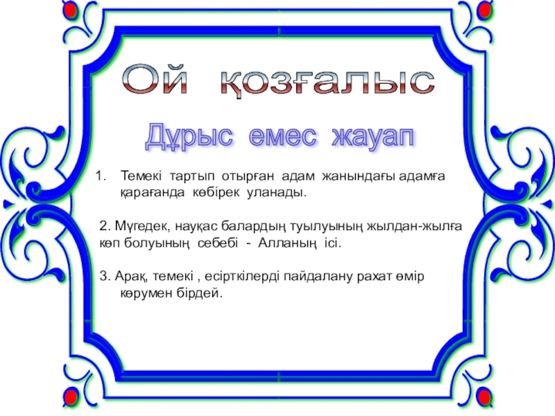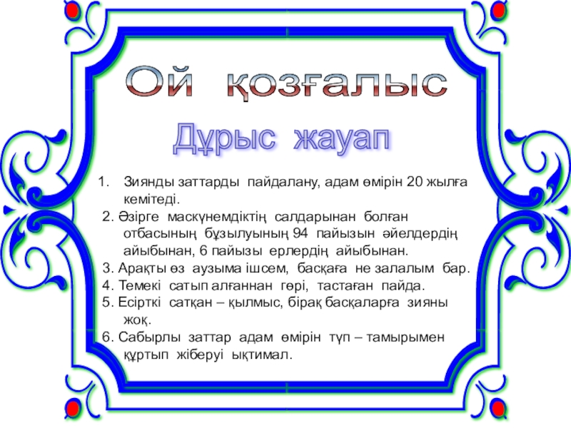 Бүгінде ерлердің -75%, әйелдердің – 34%, жас өспірімдердің 40% шылым тартса, ересек адамдардың 65% үнемі арақ ішеді екен.