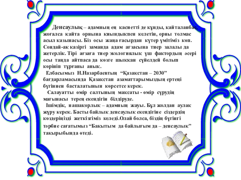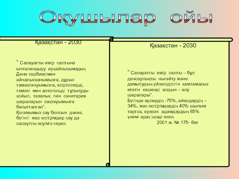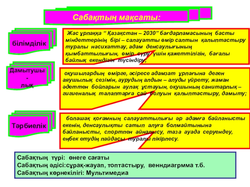 Жас ұрпаққа “ Қазақстан – 2030” бағдарламасының басты міндеттерінің бірі – салауатты өмір салтын қалыптастыру туралы насихаттау, адам денсаулығының қымбаттылығын, өмір сүру үшін қажеттілігін, бағалы байлық екендігін түсіндіру;