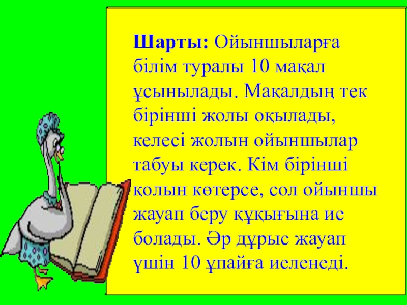 Шарты: Ойыншыларға білім туралы 10 мақал ұсынылады. Мақалдың тек бірінші жолы