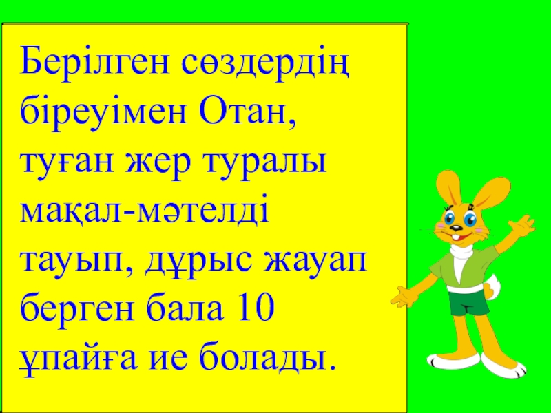 Берілген сөздердің біреуімен Отан, туған жер туралы мақал-мәтелді тауып, дұрыс жауап берген бала 10 ұпайға ие болады.