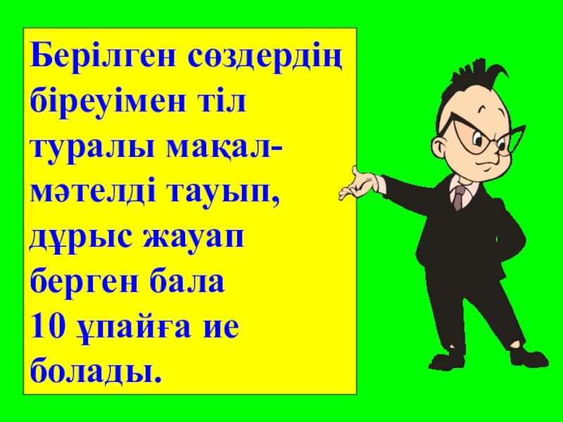 Берілген сөздердің біреуімен тіл туралы мақал- мәтелді тауып, дұрыс жауап берген бала 10 ұпайға ие болады.