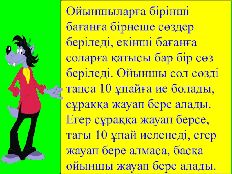 бір сөз беріледі. Ойыншы сол сөзді тапса 10 ұпайға ие болады, сұраққа жауап бере алады. Егер сұраққа жауап берсе, тағы 10 ұпай иеленеді, егер жауап бере алмаса, басқа ойыншы жауап бере алады.