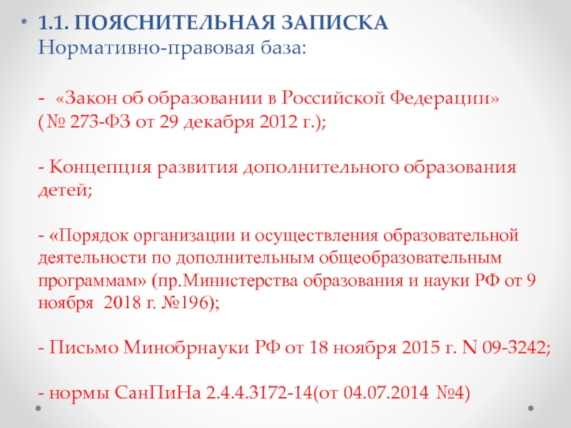 - «Порядок организации и осуществления образовательной деятельности по дополнительным общеобразовательным программам» (пр.Министерства образования и науки РФ от 9 ноября 2018 г. №196);