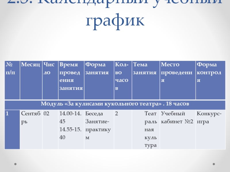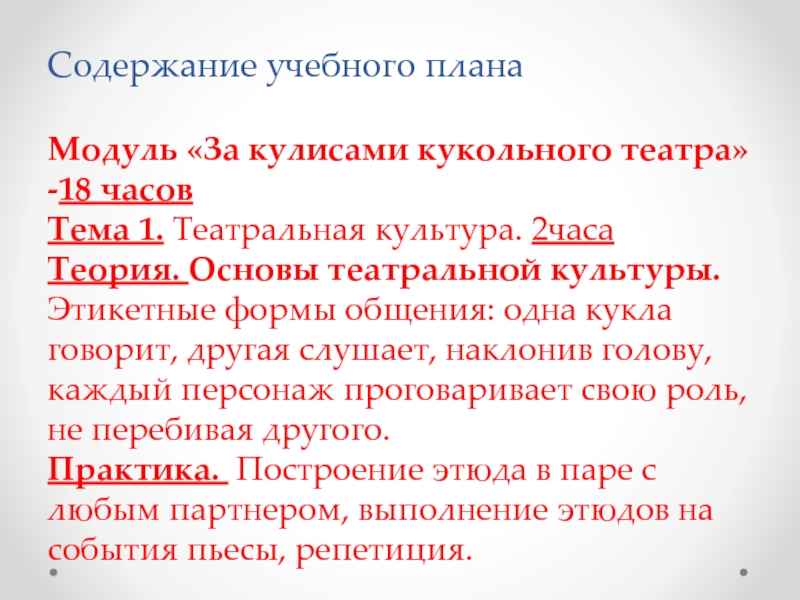(- познакомить обучающихся с основами кукольной театрализации: театральная культура, актерское мастерство, сценическая речь, сценическое движение)
