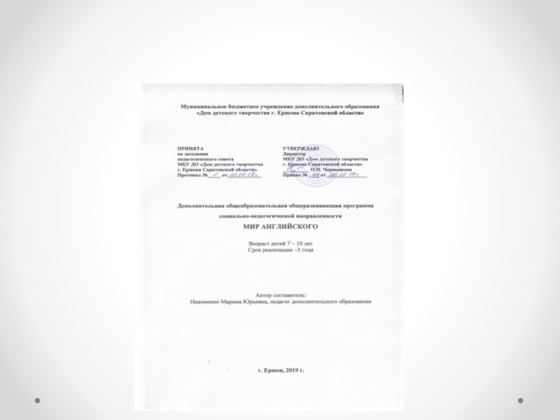 - гриф утверждения программы в соответствии с локальным нормативным актом поставщика образовательных услуг и образовательной программы, - возраст обучающих (7-10 лет);