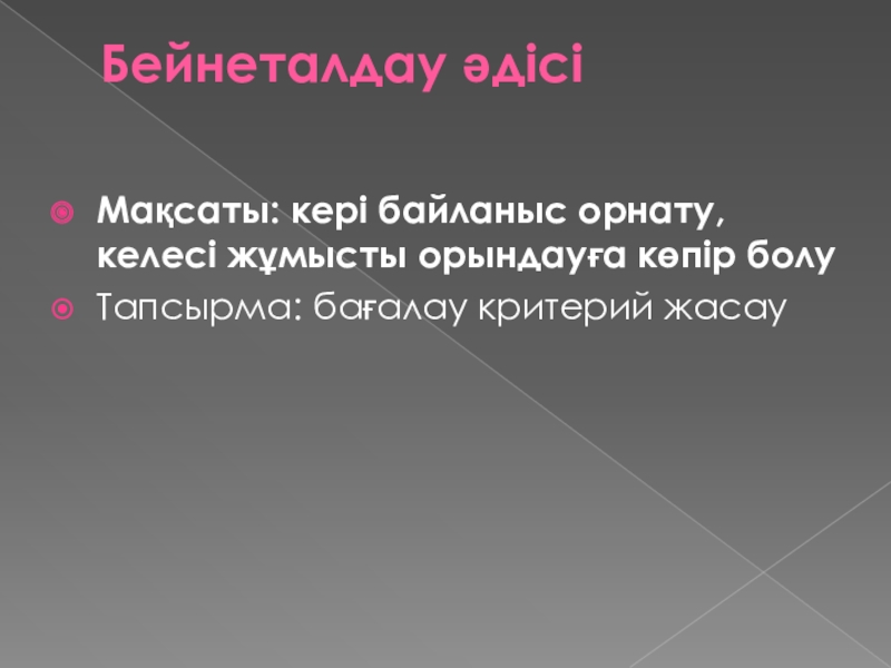 Бейнеталдау әдісі Мақсаты: кері байланыс орнату, келесі жұмысты орындауға көпір болуТапсырма: бағалау критерий жасау