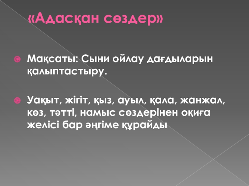«Адасқан сөздер» Мақсаты: Сыни ойлау дағдыларын қалыптастыру.Уақыт, жігіт, қыз, ауыл, қала, жанжал, көз, тәтті, намыс сөздерінен оқиға