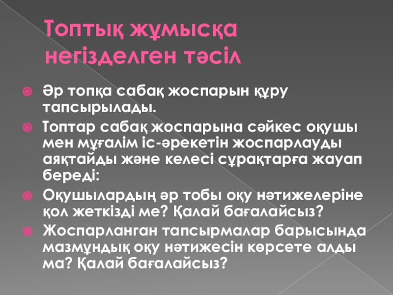 Топтық жұмысқа негізделген тәсілӘр топқа сабақ жоспарын құру тапсырылады.Топтар сабақ жоспарына сәйкес оқушы мен мұғалім іс-әрекетін жоспарлауды