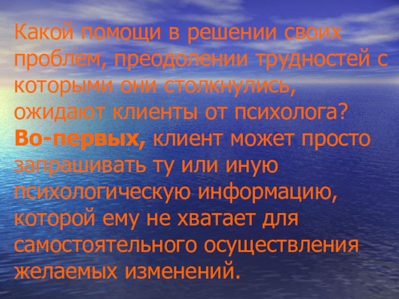 Во-первых, клиент может просто запрашивать ту или иную психологическую информацию, которой ему не хватает для самостоятельного осуществления желаемых изменений.