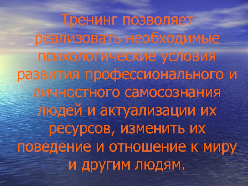 Слайд 9Тренинг позволяет реализовать необходимые психологические условия развития профессионального и личностного самосознания