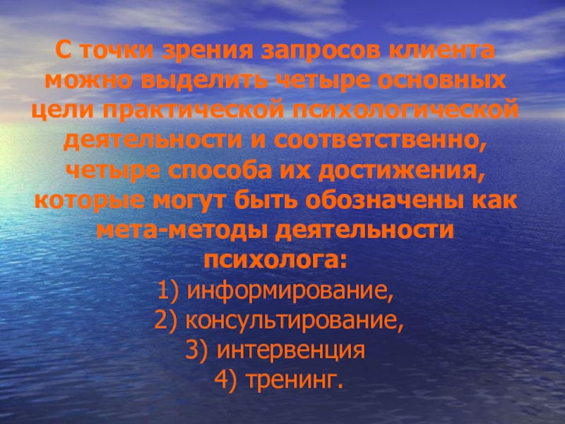 Слайд 15С точки зрения запросов клиента можно выделить четыре основных цели практической