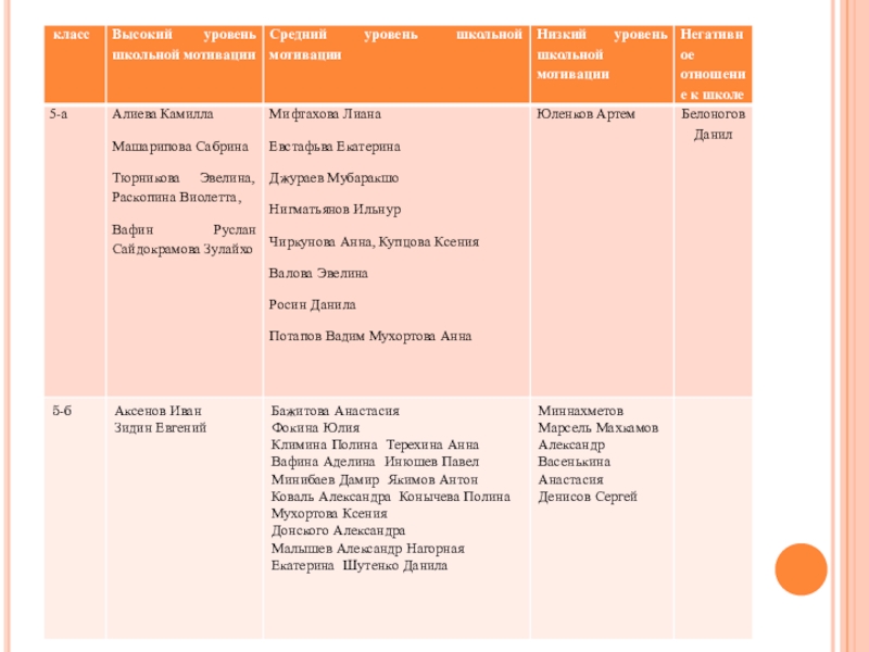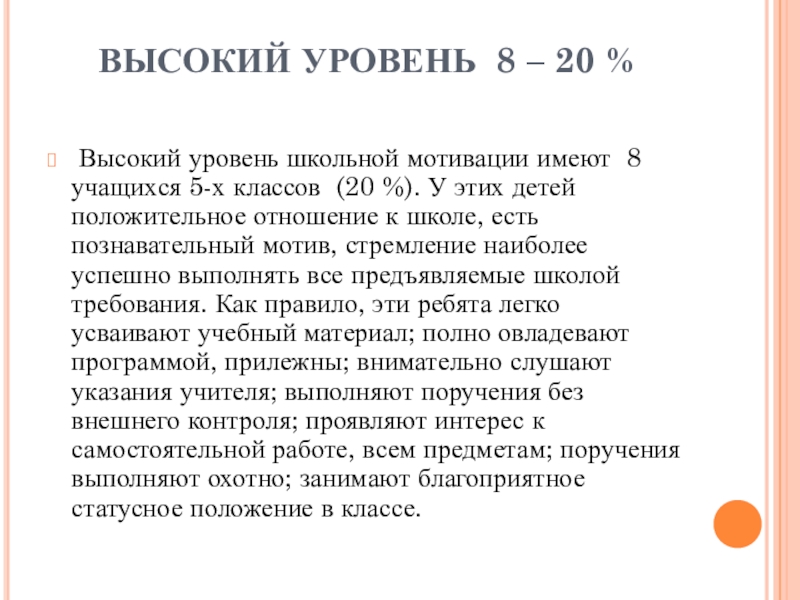 учащихся 5-х классов (20 %). У этих детей положительное отношение к школе, есть познавательный мотив, стремление наиболее успешно выполнять все предъявляемые школой требования. Как правило, эти ребята легко усваивают учебный материал; полно овладевают программой, прилежны; внимательно слушают указания учителя; выполняют поручения без внешнего контроля; проявляют интерес к самостоятельной работе, всем предметам; поручения выполняют охотно; занимают благоприятное статусное положение в классе.