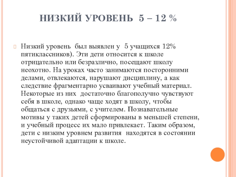 12% пятиклассников). Эти дети относится к школе отрицательно или безразлично, посещают школу неохотно. На уроках часто занимаются посторонними делами, отвлекаются, нарушают дисциплину, а как следствие фрагментарно усваивают учебный материал. Некоторые из них достаточно благополучно чувствуют себя в школе, однако чаще ходят в школу, чтобы общаться с друзьями, с учителем. Познавательные мотивы у таких детей сформированы в меньшей степени, и учебный процесс их мало привлекает. Таким образом, дети с низким уровнем развития находятся в состоянии неустойчивой адаптации к школе.