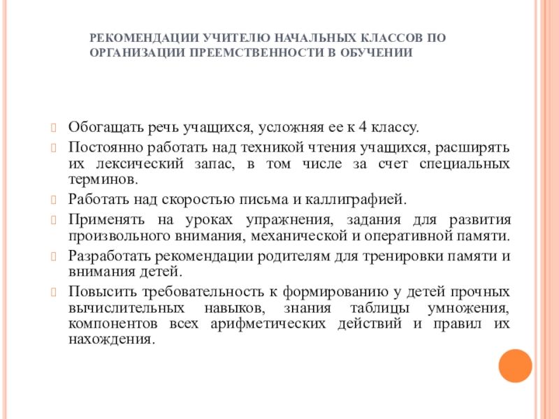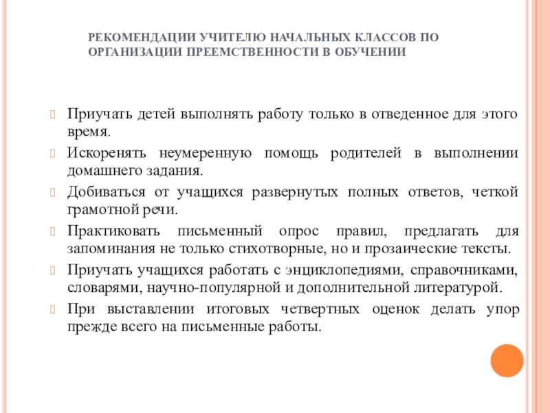 Слайд 15РЕКОМЕНДАЦИИ УЧИТЕЛЮ НАЧАЛЬНЫХ КЛАССОВ ПО ОРГАНИЗАЦИИ ПРЕЕМСТВЕННОСТИ В ОБУЧЕНИИ