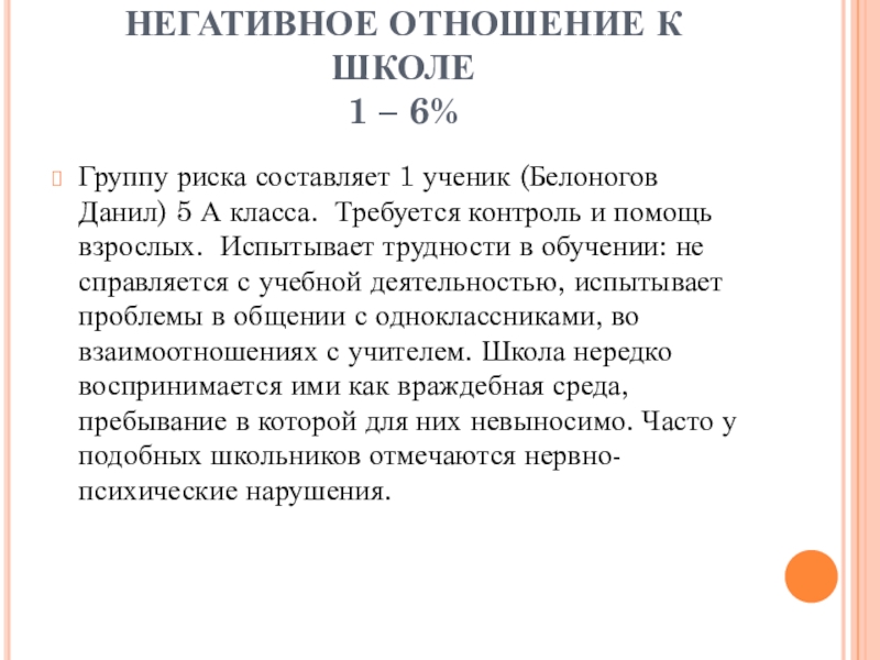 (Белоногов Данил) 5 А класса. Требуется контроль и помощь взрослых. Испытывает трудности в обучении: не справляется с учебной деятельностью, испытывает проблемы в общении с одноклассниками, во взаимоотношениях с учителем. Школа нередко воспринимается ими как враждебная среда, пребывание в которой для них невыносимо. Часто у подобных школьников отмечаются нервно-психические нарушения.